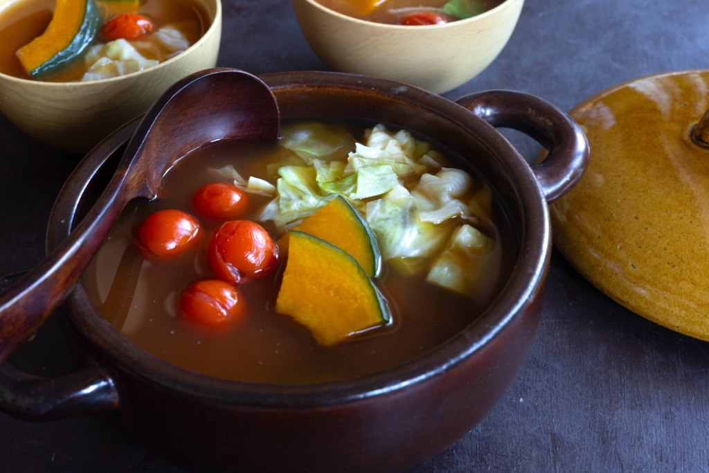2 鍋にAを入れて中火で加熱し、沸騰したら弱火にし、かぼちゃとキャベツを加え、柔らかくなるまで煮る。